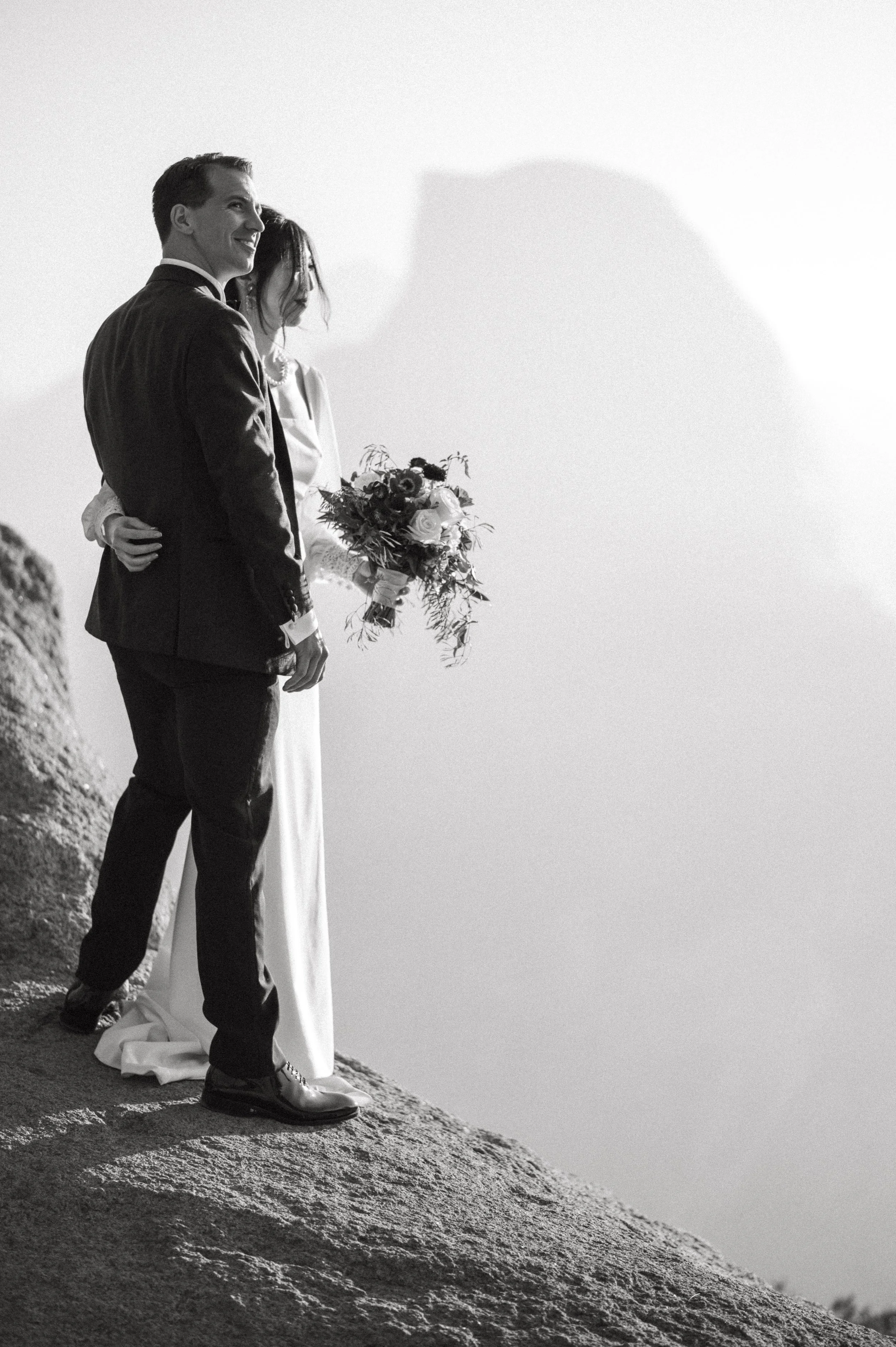 Photo: myself, Carson Lillard Photography, Dress customized and altered/veil: BHLDN, Groom's tux jacket: Giorgio Armani, Cake, bouquets/boutonnieres: Sweet Dreams Wedding Cakes and Flowers, Cake topper: Etsy (MadeAndCoShop), Neon sign "To the moon and back": Etsy (sunnyneon), Reception venue: rental cabin at Yosemite West)